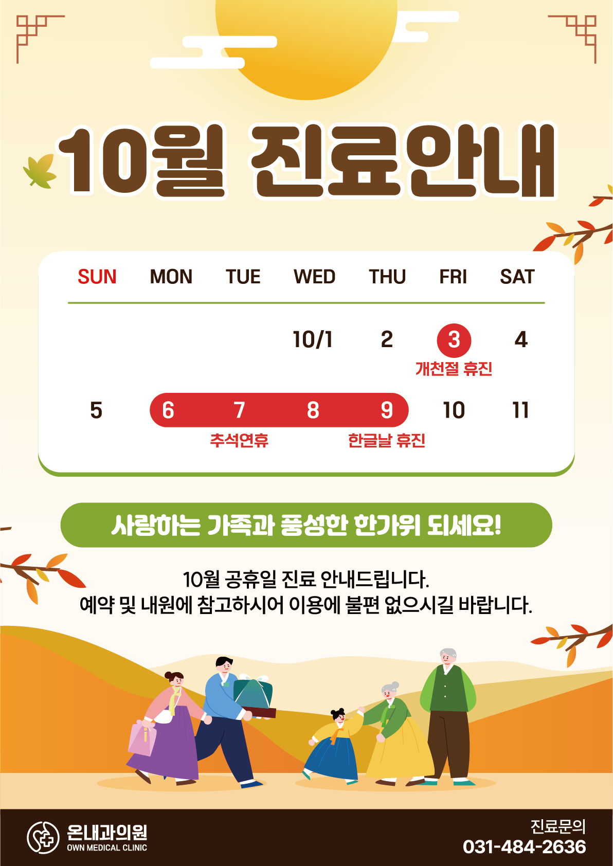9월 3일(금) 개천절 휴진 / 9월 6일(월)~9월 9일(목) 추석 연휴 및 한글날 휴진