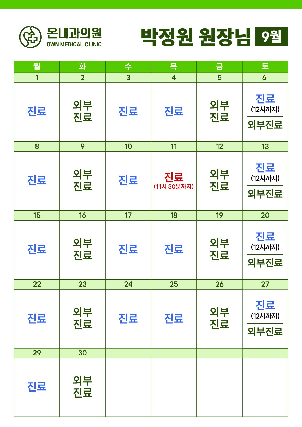 9월 의료진 휴진, 토요일 진료일정 안내드립니다.