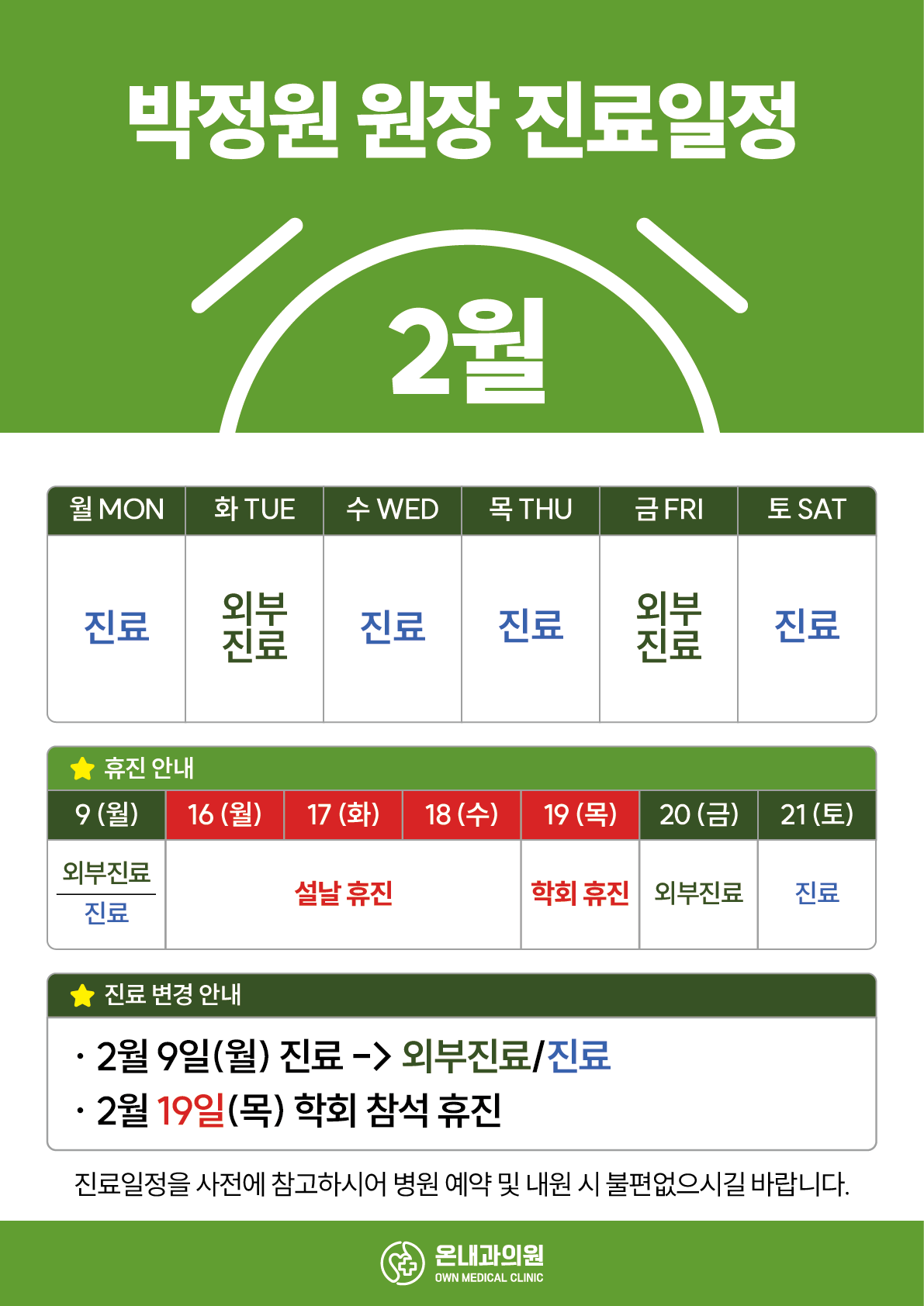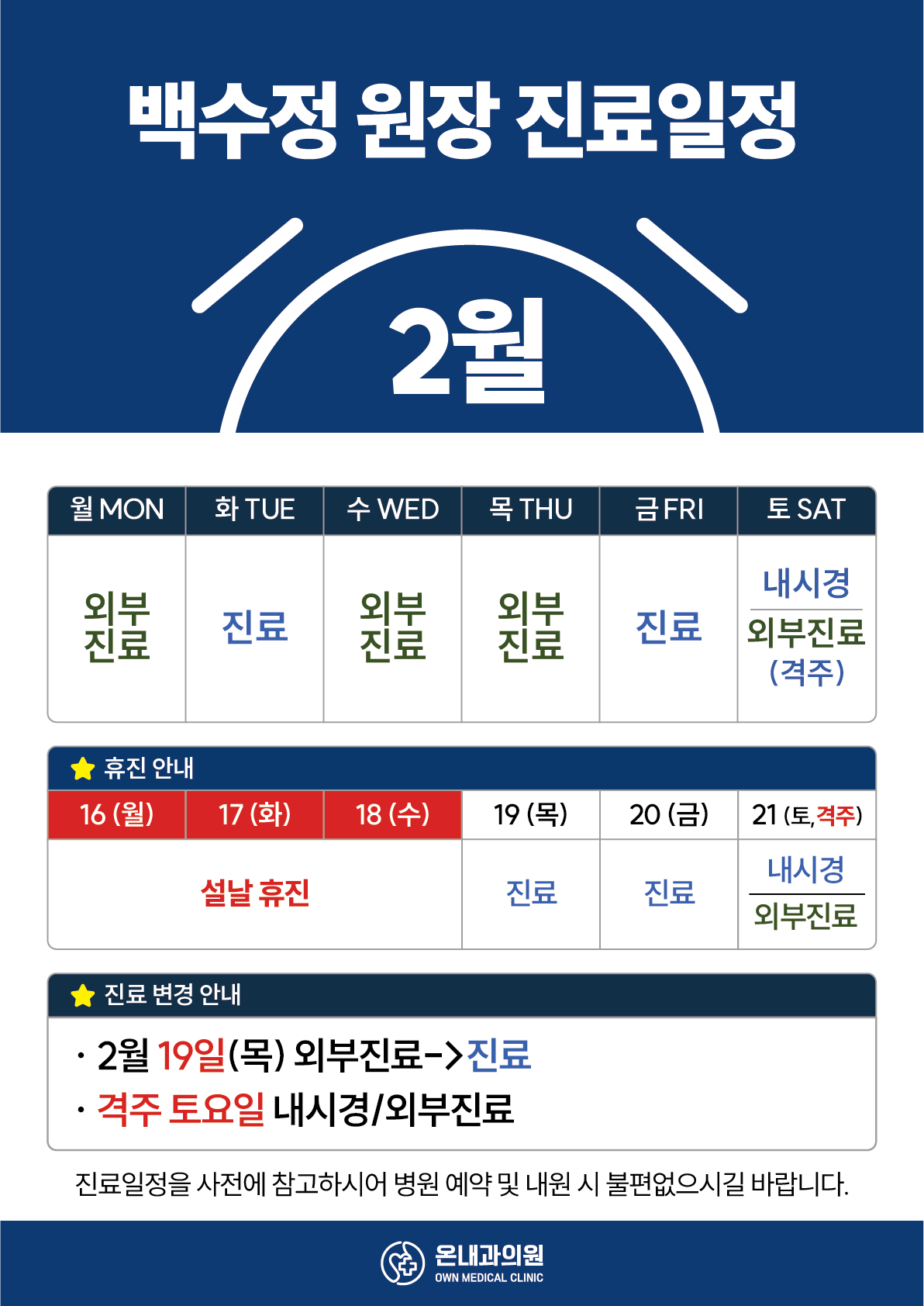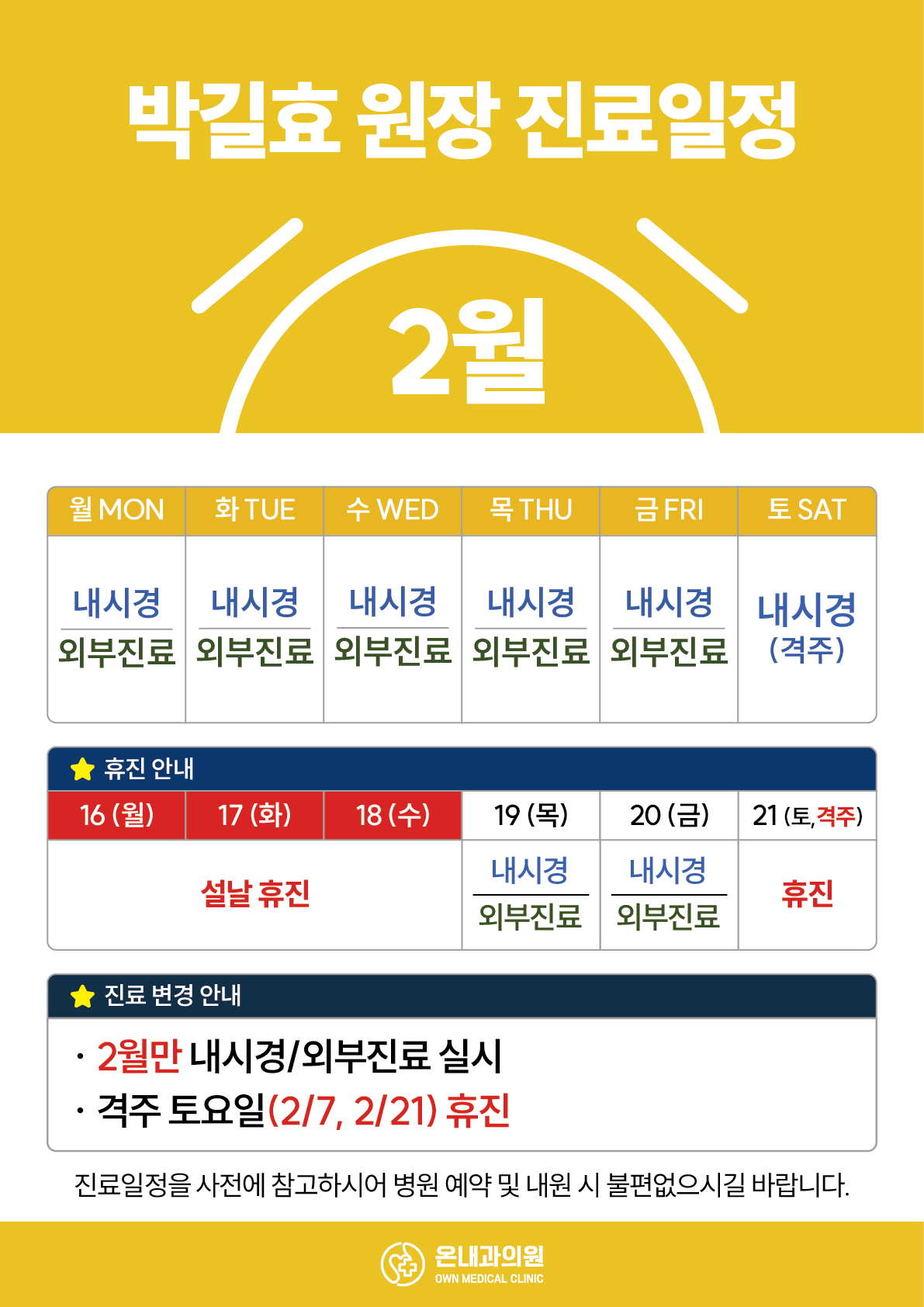 2월 의료진 휴진, 토요일 진료일정 안내드립니다.