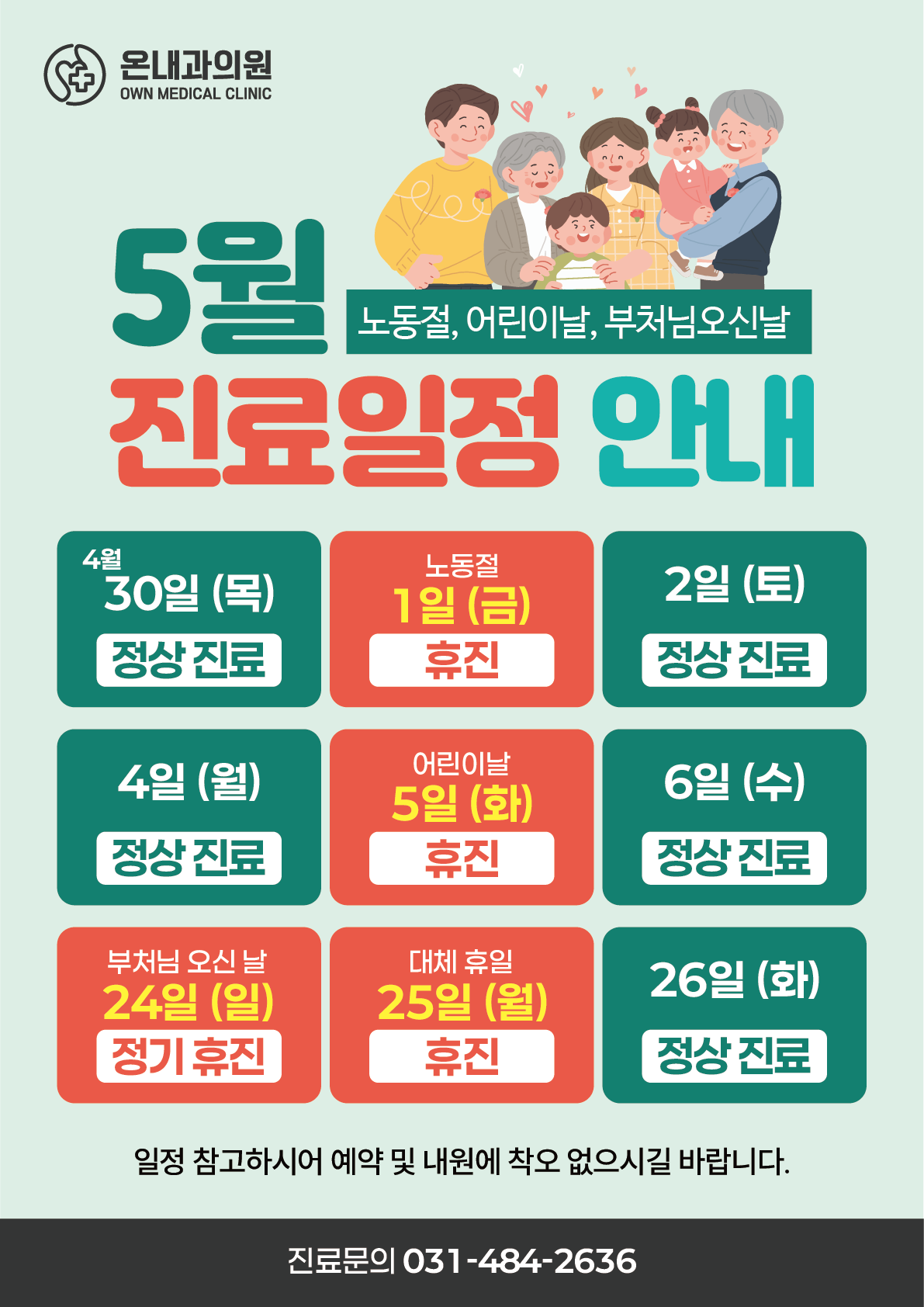 5월 1일(금) 노동절 휴진,  5월 5일(화) 어린이날 휴진